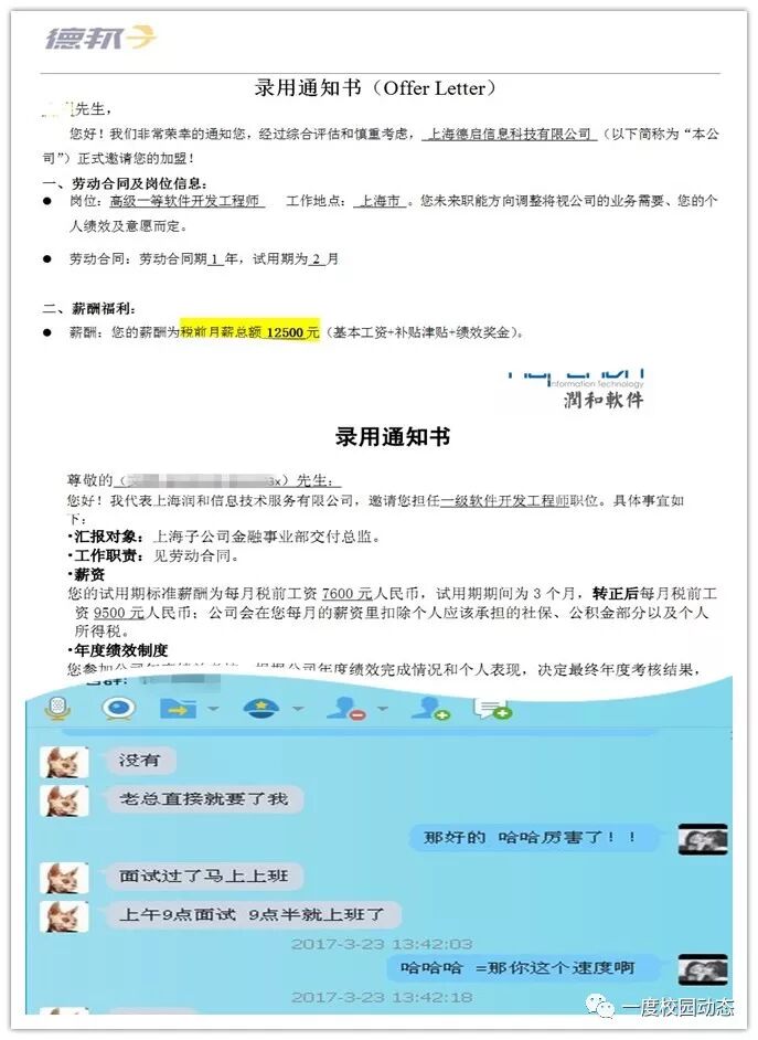 努力,做得更好 ——Java“攻城狮”,只做高薪offer的“收割机” 在一度教育,我们的口号是“Do Our Best”,我们每天都在努力,做更好的自己,所以,我对未来充满了信心。 因为带着Java“攻城狮”的梦想出发,所以我会经常关注已经毕业的一度师哥师姐们的就业信息,当然,学校每一次就业喜讯的发布,都会让我心中暗暗感叹:哇,原来我们一度教育毕业的师哥师姐们biger是这么的高,他们简直就是名企高薪offer的“收割机”,有同学开玩笑:一度学子出征(职场),(职场)寸草不生。我坚信,再过一年之后,我们也是这么的高biger。 一度出征,寸草不生,以下有图有真相: